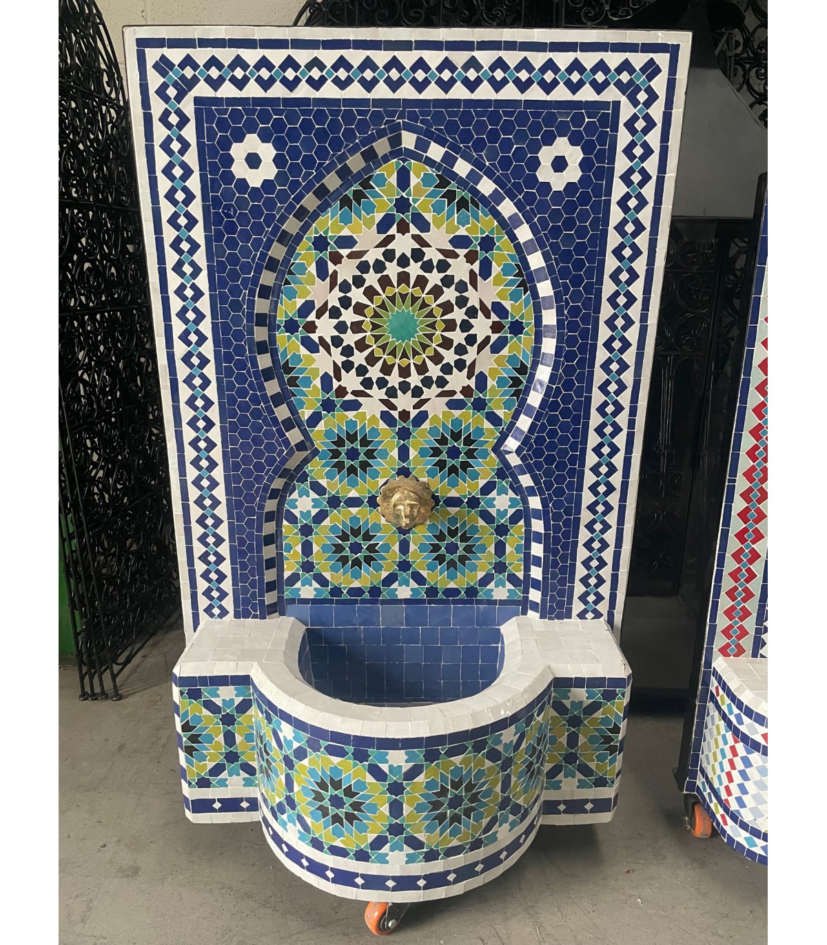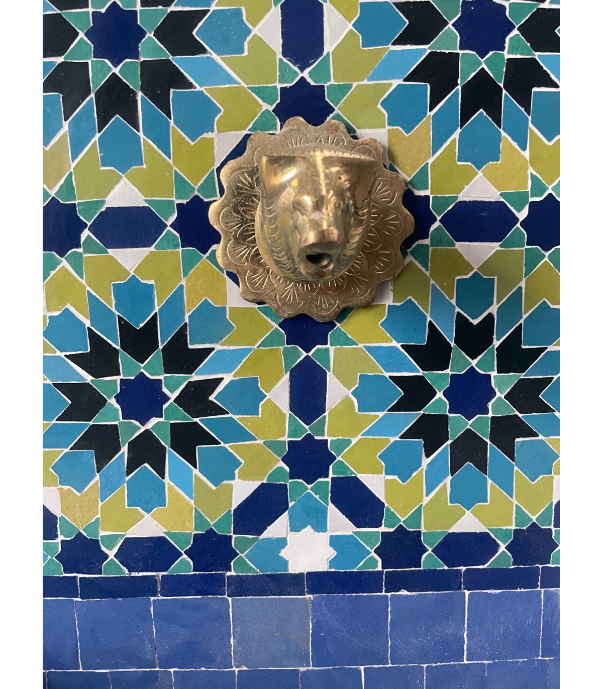Fontaine en mosaïque artisanale fort>Andalou élaboré, conçu et assemblé en Marocpar des maîtres artisans de la célèbre ville de FEZ utilisant la technique ancestrale du zelige, enseignée par les maîtres artisans de l'ancienne Al-Andalus et entretenue jusqu'à présent de père en fils.
