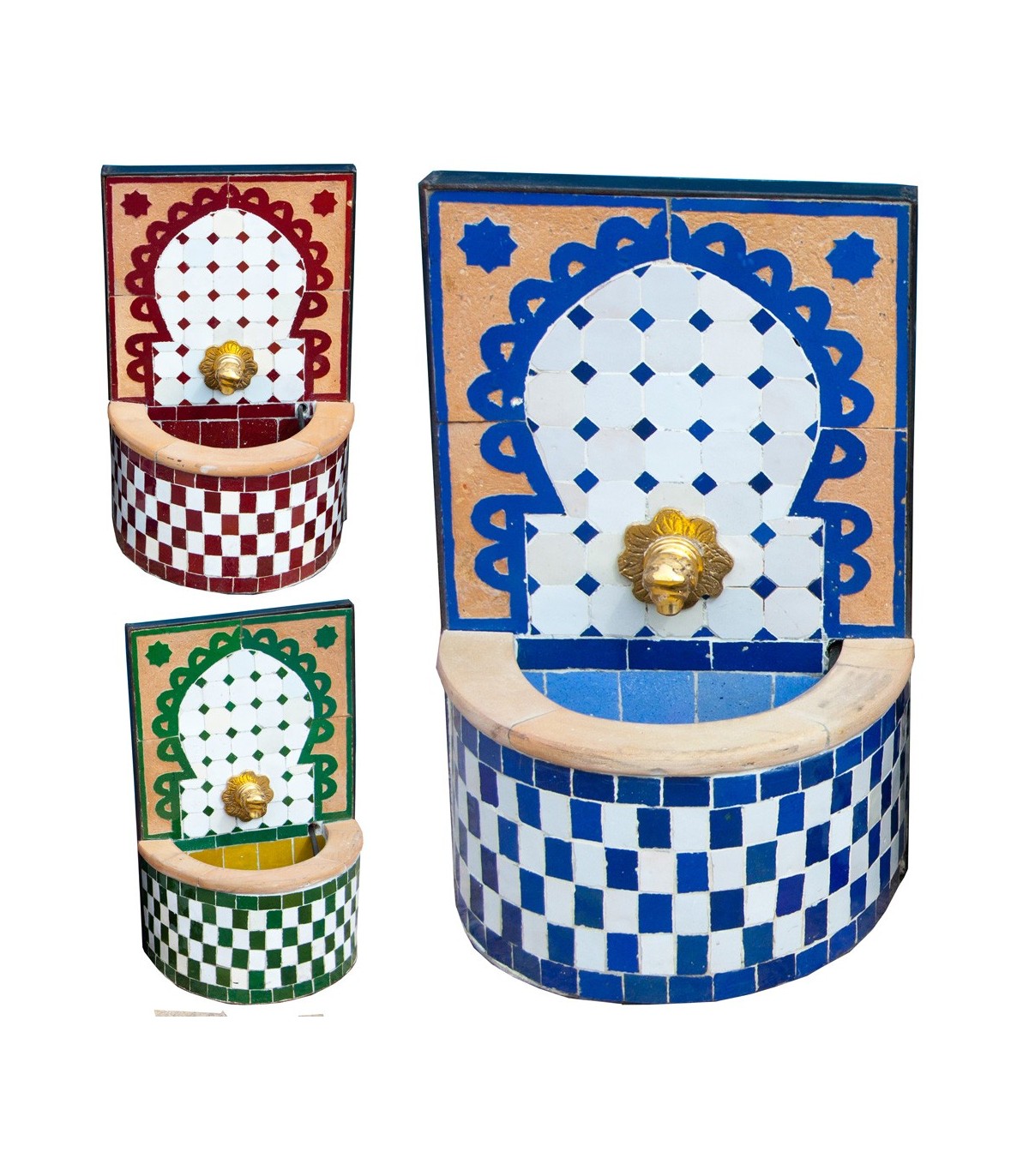 Conceptions eau fontaine en mosaïque faites en arabe.Disponible en différentes couleurs (voir photo).Si vous voulez un peu de couleur / design particulier nous.Comprend l'installation de l'eau en circuit...