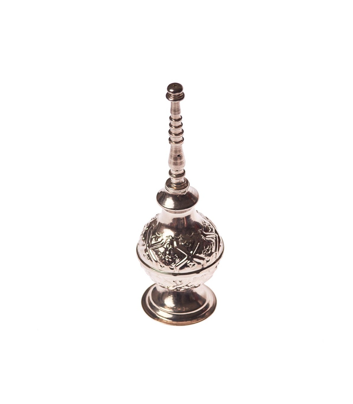 Perfumero alpaca grabada. Se suele utilizar para el agua de rosas o azahar. Se desmonta en dos piezas. Medidas: 22 cm.