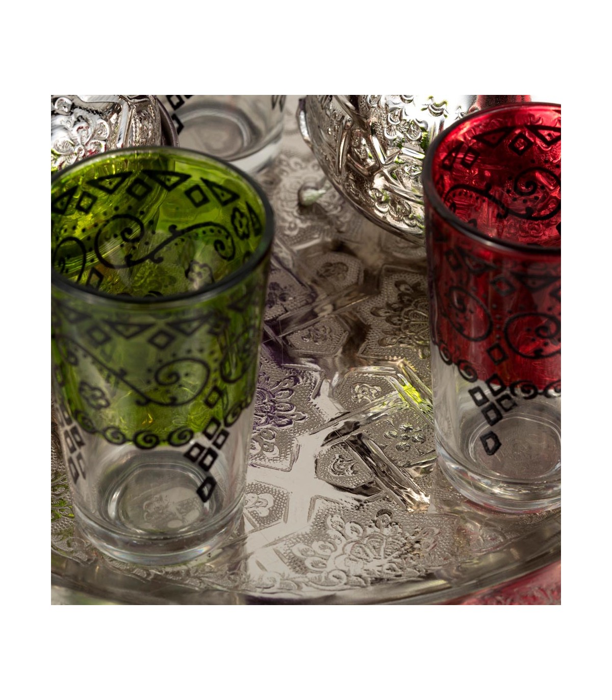 - Théière modèle SULTAN Grande 1,2 l.- 12 verres à thé peints au henné. Lunettes de haute qualité- Grand sucrier- Grand plateau avec pieds...