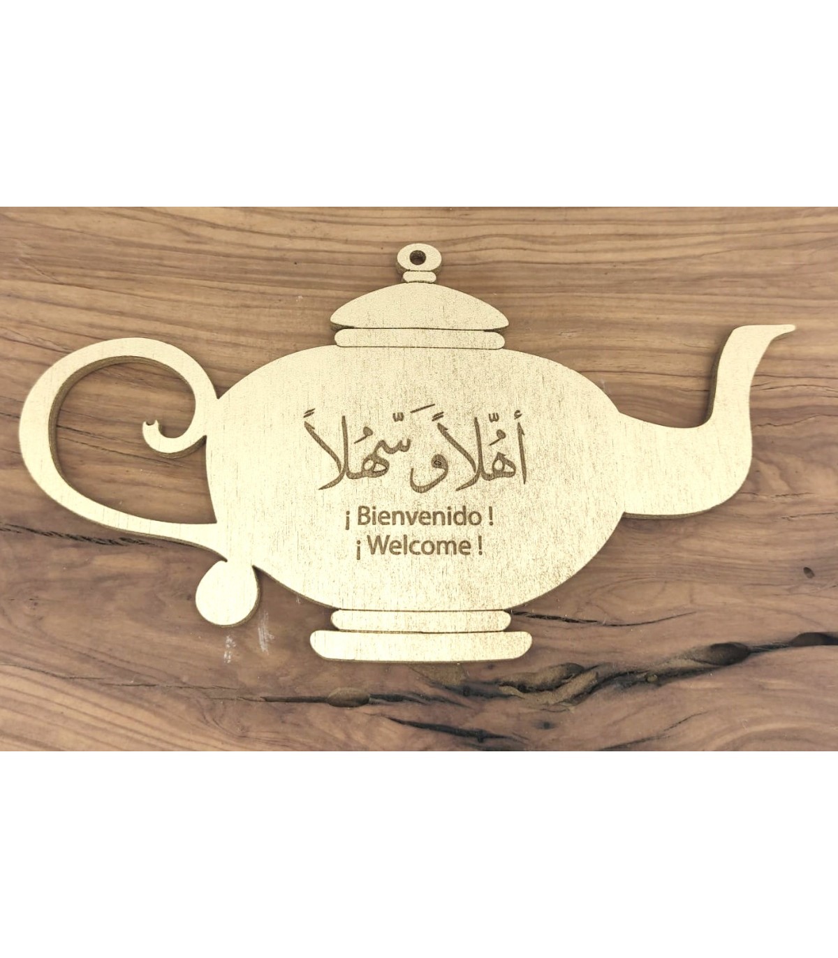 Élégant théière décorative en bois avec gravure laser du message de bienvenue en arabe, espagnol et anglais (أهلاً وسهلاً | Bienvenue! | Welcome!). Son design en forme de théière reflète l' hospitalité arabe et apporte une touche chaleureuse et exotique à n'importe quel espace.