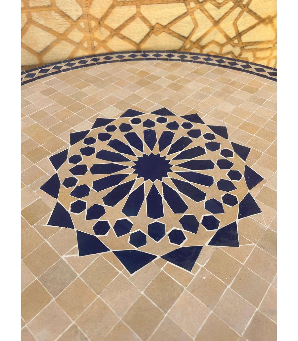 Table de mosaïque artisanale andalouse élaborée, conçue et assemblée en Maroc par des maîtres artisans de la célèbre ville de FEZ en utilisant la technique ancestrale de la tuile de zelige, enseignée par les maîtres artisans de l'ancienne Al-Andalus et maintenue jusqu'à présent de pères en fils.
