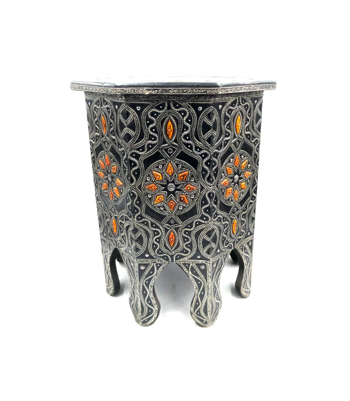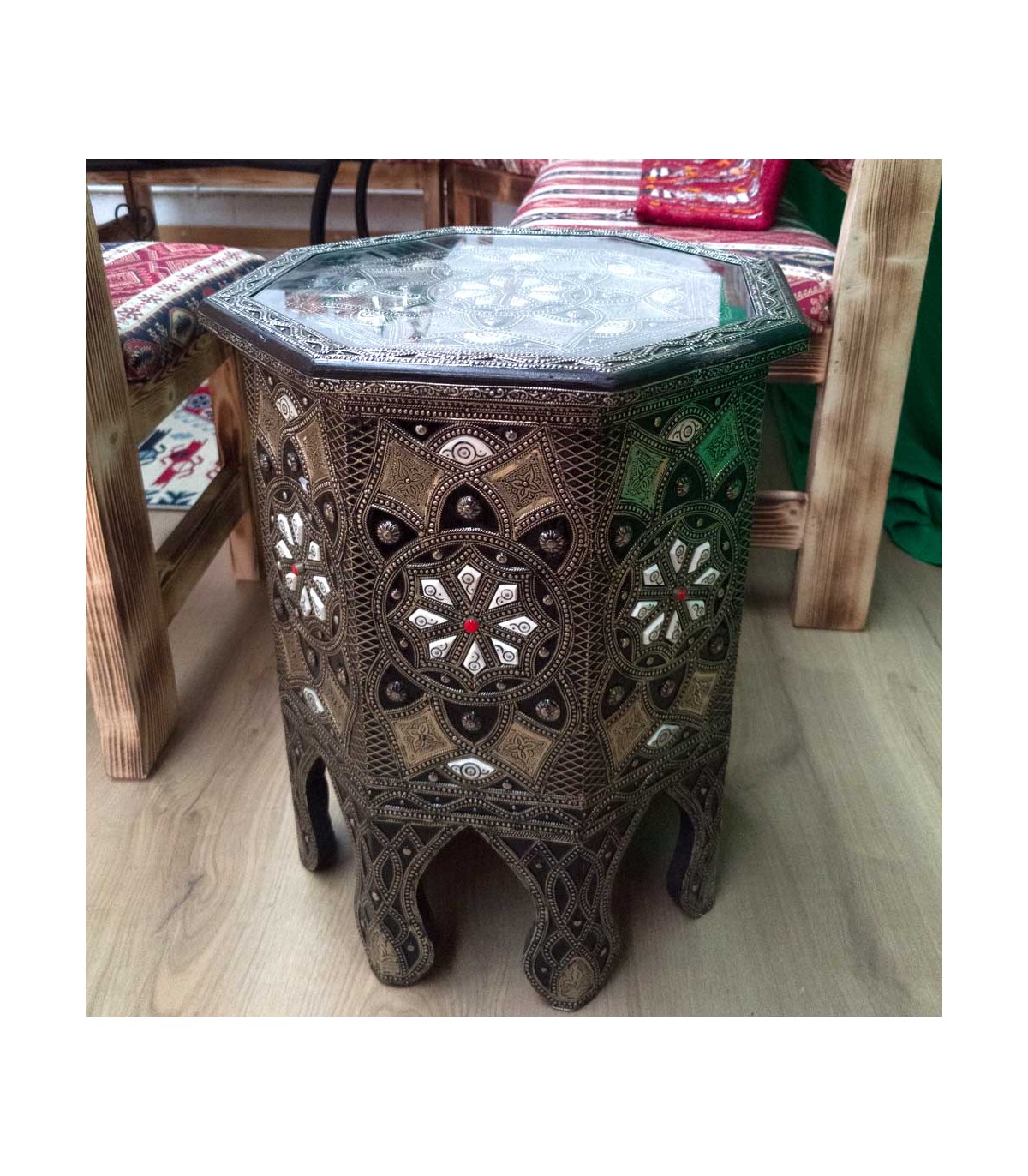 Table d'appoint marocaine en bois, os et maillechort gaufré, fabrication artisanale au Maroc. Grande pièce d'artisanat, idéale pour décorer tout type de maison. Décoration arabe, mauresque, andalouse, bohème, minimaliste. Il se combinera bien dans n'importe quel coin de votre maison de style andalou.