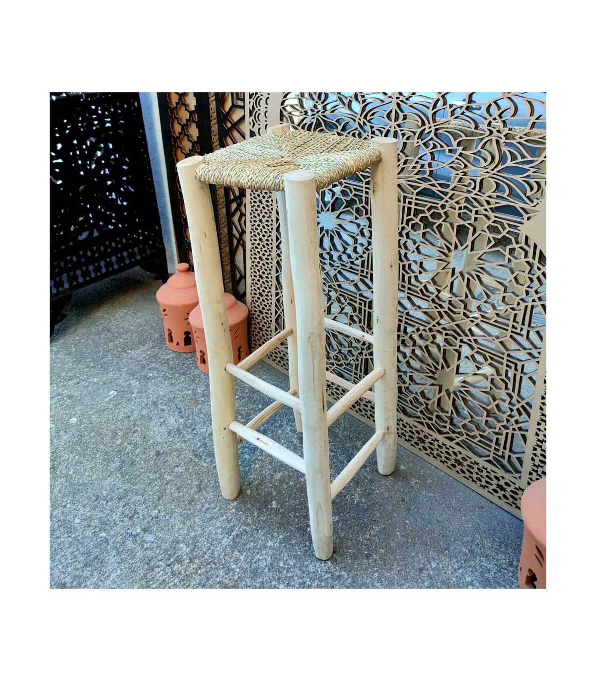 Ce tabouret rustique a été conçu par des menuisiers marocains qui ont hérité des secrets du bureau et des menuisiers de génération en génération.