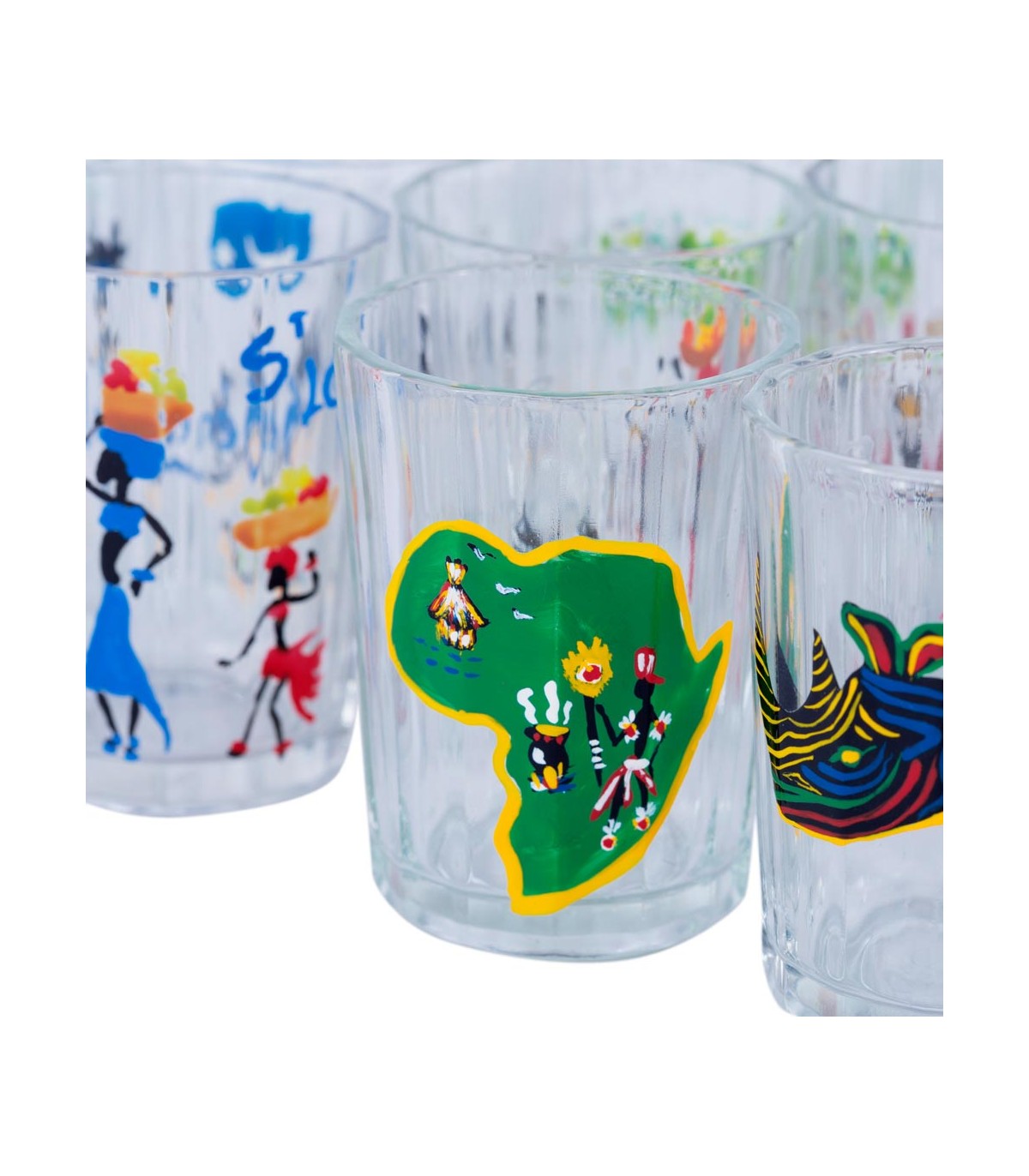 Produit unique et exclusif. Ensemble de 12 verres, chacun différent et magique. Conçu et peint à la main par un artiste africain. Une seule fois, il a mis sa peinture tribale sur du verre.