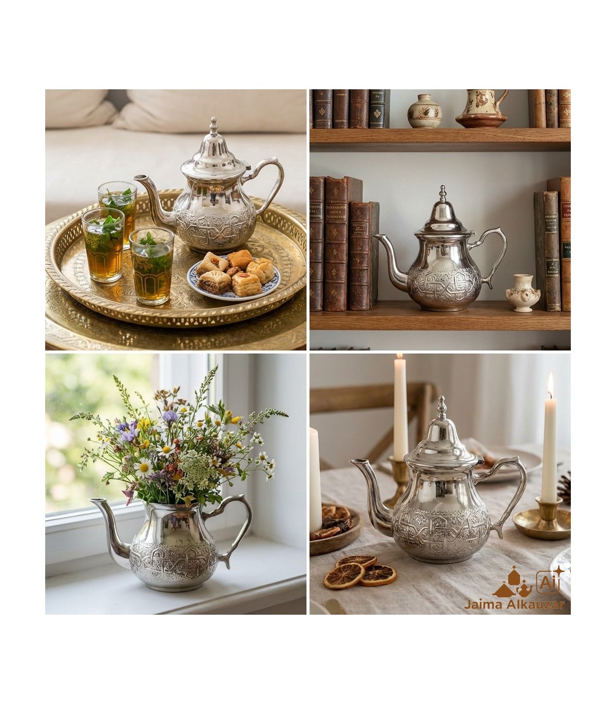 Théière Moruna pour faire du thé, en maillechort repoussé de motifs arabes.