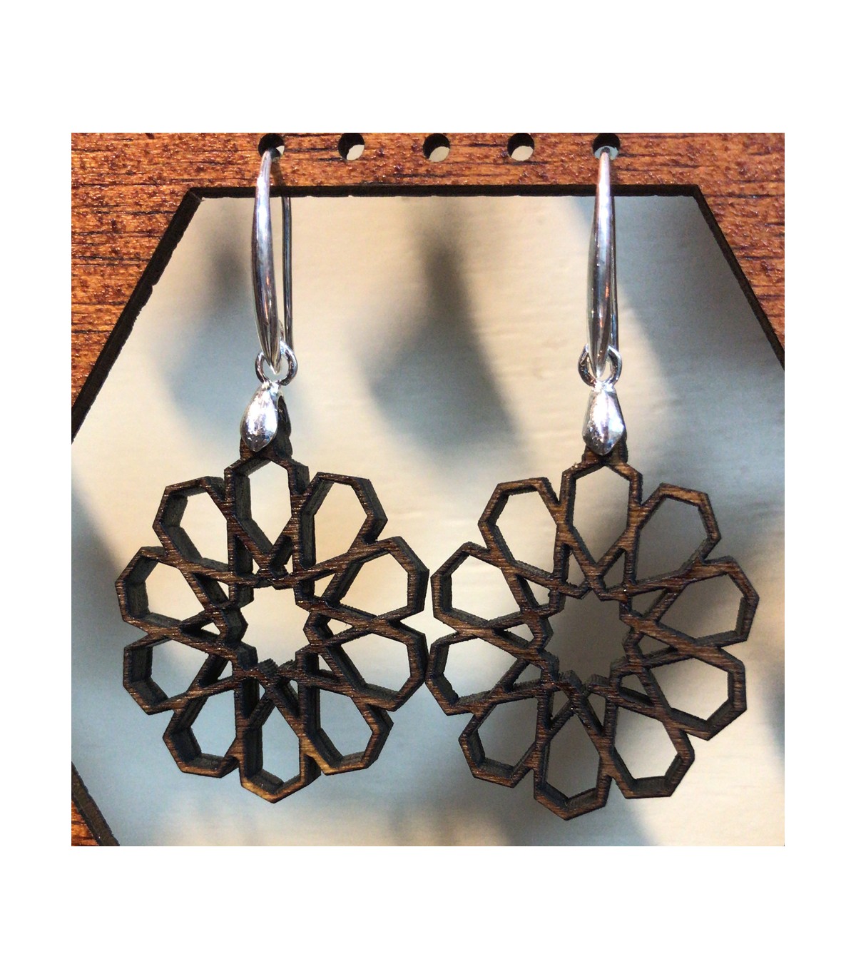 Orecchini modello Najma realizzati in legno di ulivo e montati in argento sterling 925.Ispirato ai reticoli, ai mosaici e ai bordi di Alhambra e Generalife.