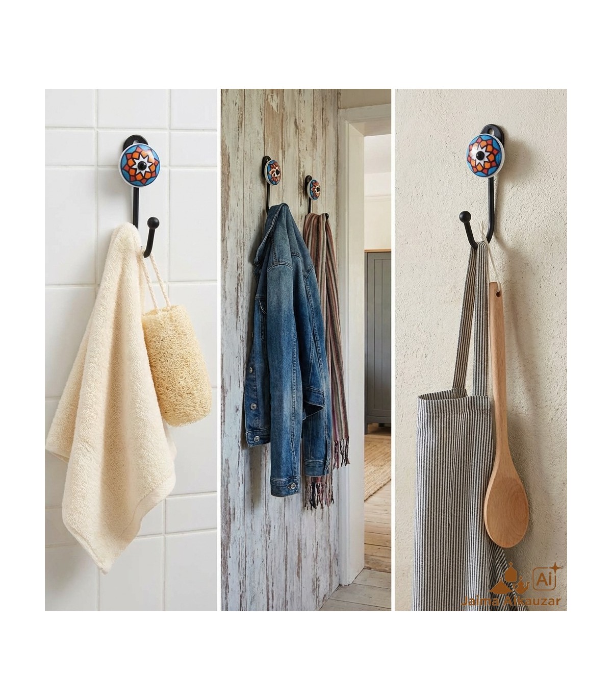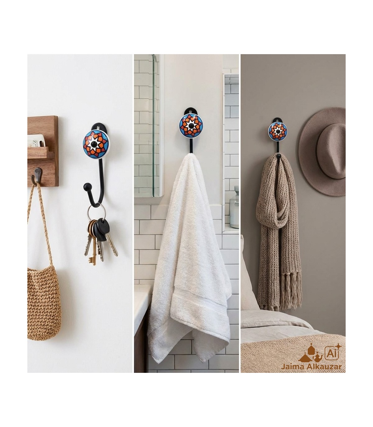 Il braccio appendiabiti è realizzato in resistente ferro battuto, garantendo durata e un aspetto robusto. La decorazione in ceramica, adornata con motivi floreali arabi, conferisce un fascino unico e autentico. Il suo design floreale e geometrico evoca un'atmosfera andalusa, riempiendo il tuo spazio di storia e bellezza.