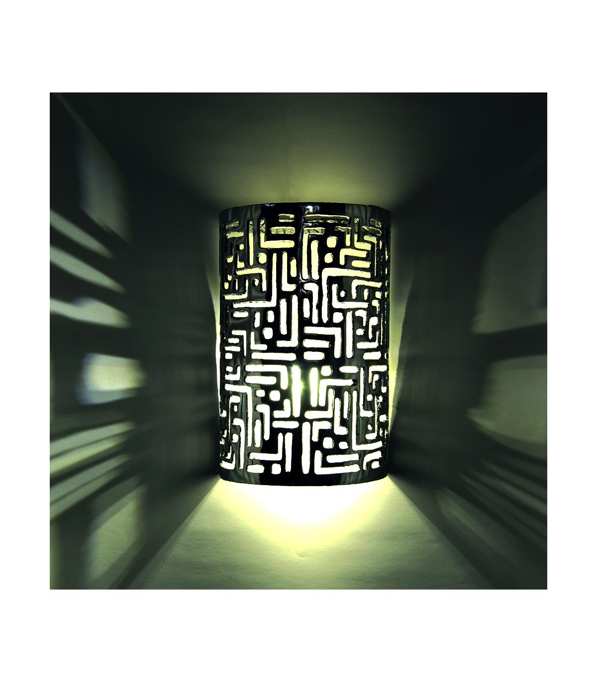 Applicare a mano realizzato in alluminio lucidato. Progettato con motivi traforati. Prodotto molto attraente e ben rifinito. È elegante sia off e on. Misure: 28 x 25 cm