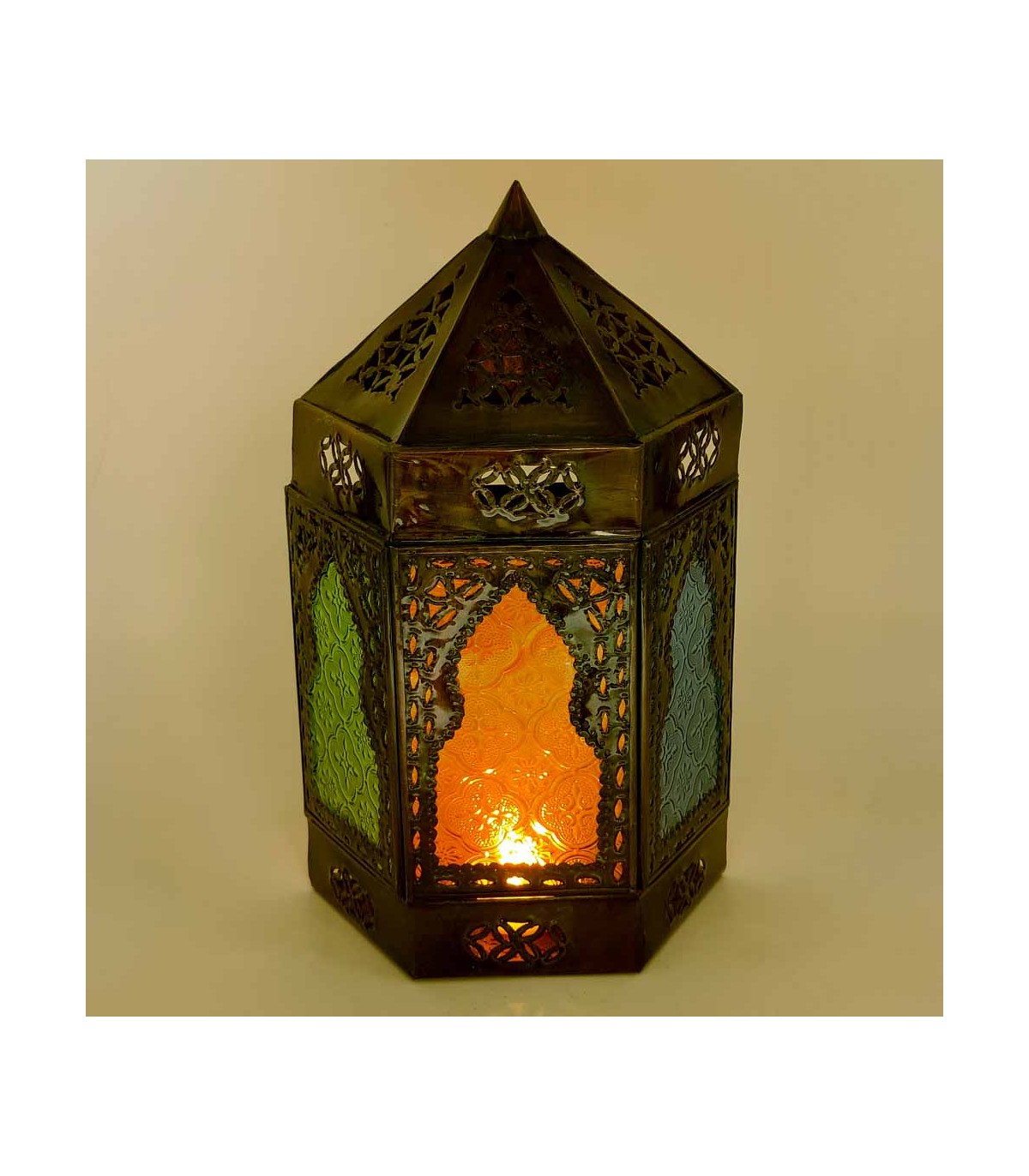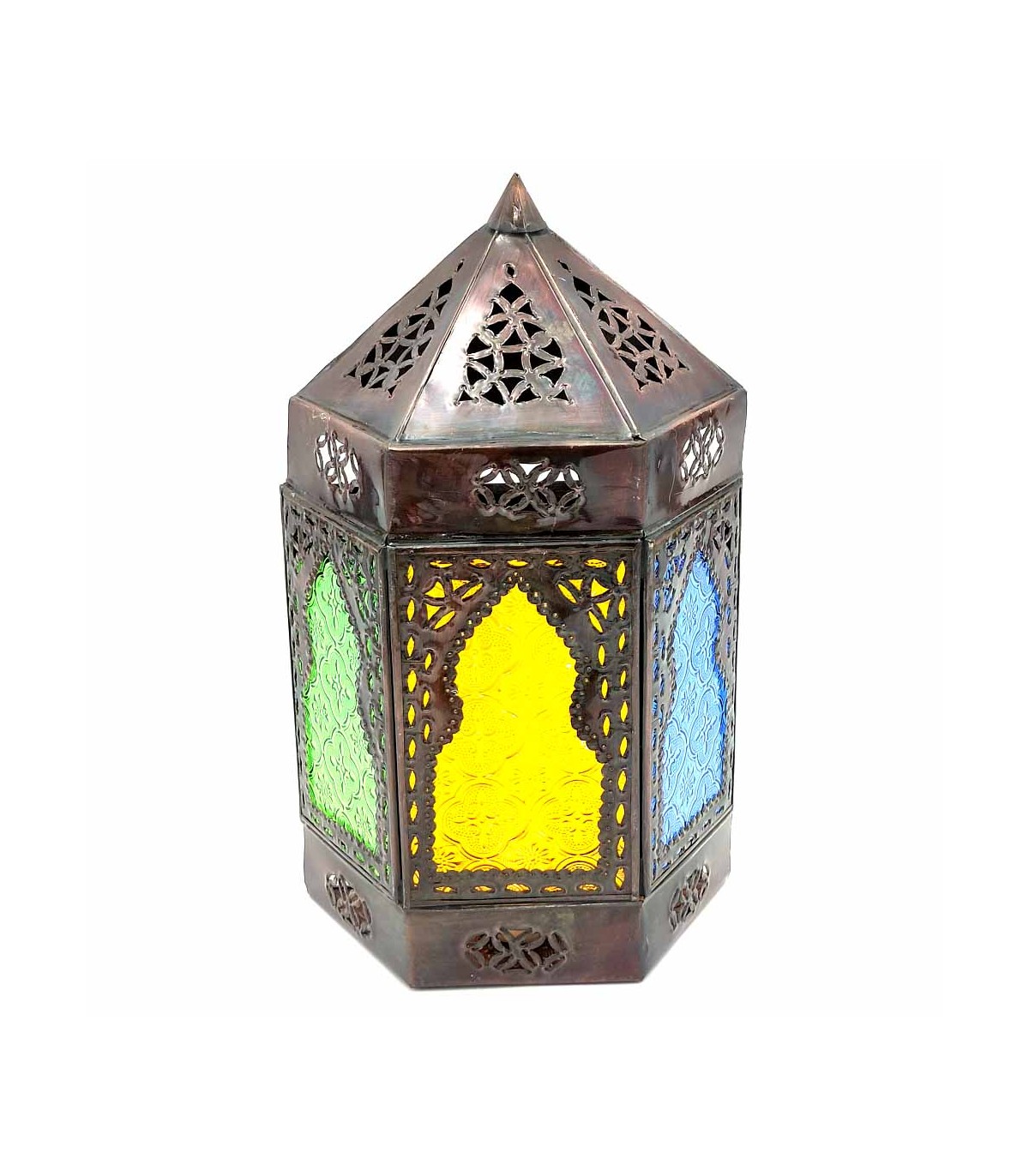 Applica Cristallo e metallo traforato con motivi arabi, ideali per la decorazione andalusa della tua casa. Realizzato artigianalmente con cristalli grezzi multicolori. Arco arabo o design della finestra.Applique per interni ideale per arredare un corridoio, le scale o qualsiasi angolo della tua casa araba creando un'atmosfera accogliente grazie ai suoi disegni geometrici.Ha una base piatta quindi può essere utilizzato anche come portacandele. Trattandosi di prodotti artigianali, i disegni ei colori possono variare leggermente dalle foto.Si tratta di una lampada da parete con paralume quindi l'installazione della lampadina dovrà essere preventivamente installata, prima di appendere questa lampada da parete che potete acquistare nel nostro negozio online ad un buon prezzo. Dimensioni: 30 cm