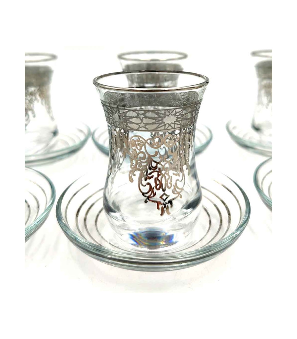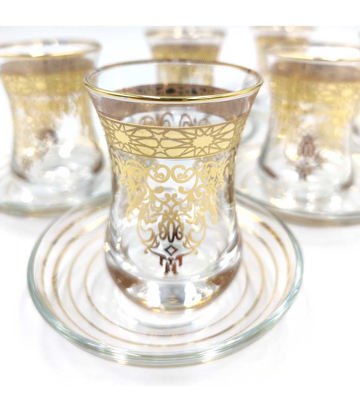 Set di 6 bicchieri da tè turchi con piattini. Realizzato in vetro temperato di alta qualità e decorato con disegni geometrici ispirati ad al-Andalus. Ideale per bere il tè nero alla turca.
