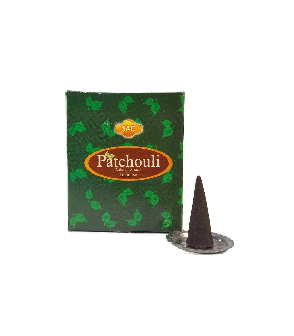 Incenso di marca SAC. Il Patchouli è un arbusto dall'aroma esotico, forte e penetrante oltre che dolce e speziato. L'olio si ottiene dalle foglie giovani, essiccate e fatte fermentare prima della distillazione. Il suo aroma combatte la depressione, è sedativo, calmante, con effetto antistress ed equilibrante. Al mattino dona energia e alla sera agisce come afrodisiaco, poiché il suo aroma sensuale stimola il desiderio sessuale e riduce l'inibizione.
