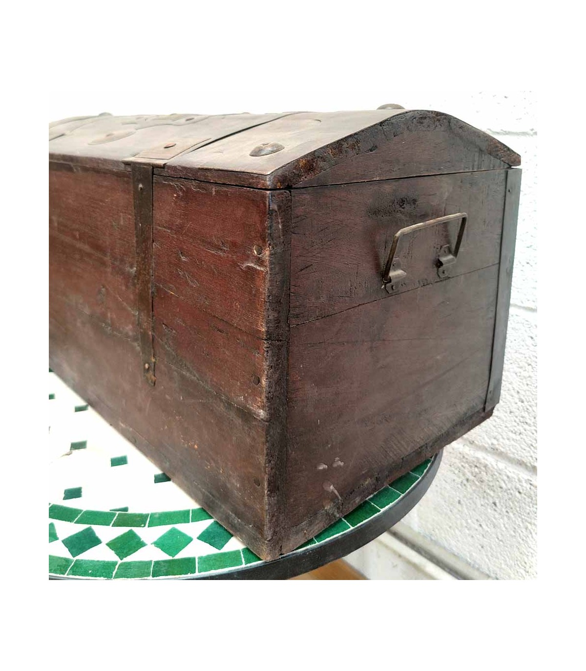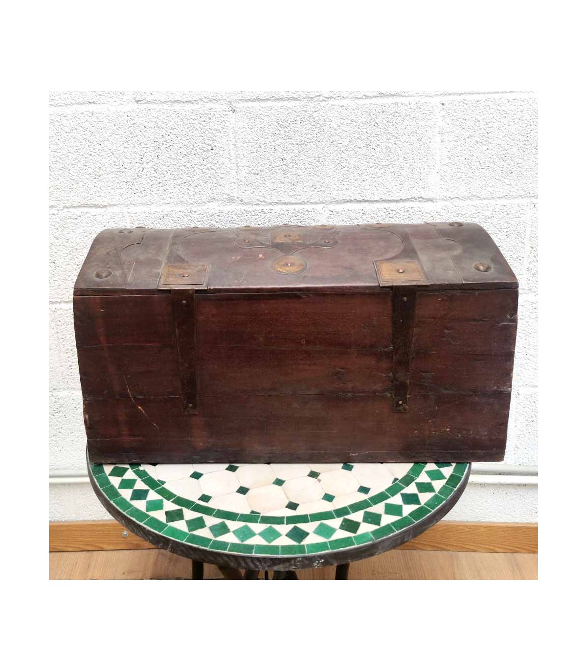 Cassapanca in legno decorata con rivetti in metallo realizzata artigianalmente in Mauritania. Stile tuareg. Baule vintage molto simile a quello della famosa serie Vikings.