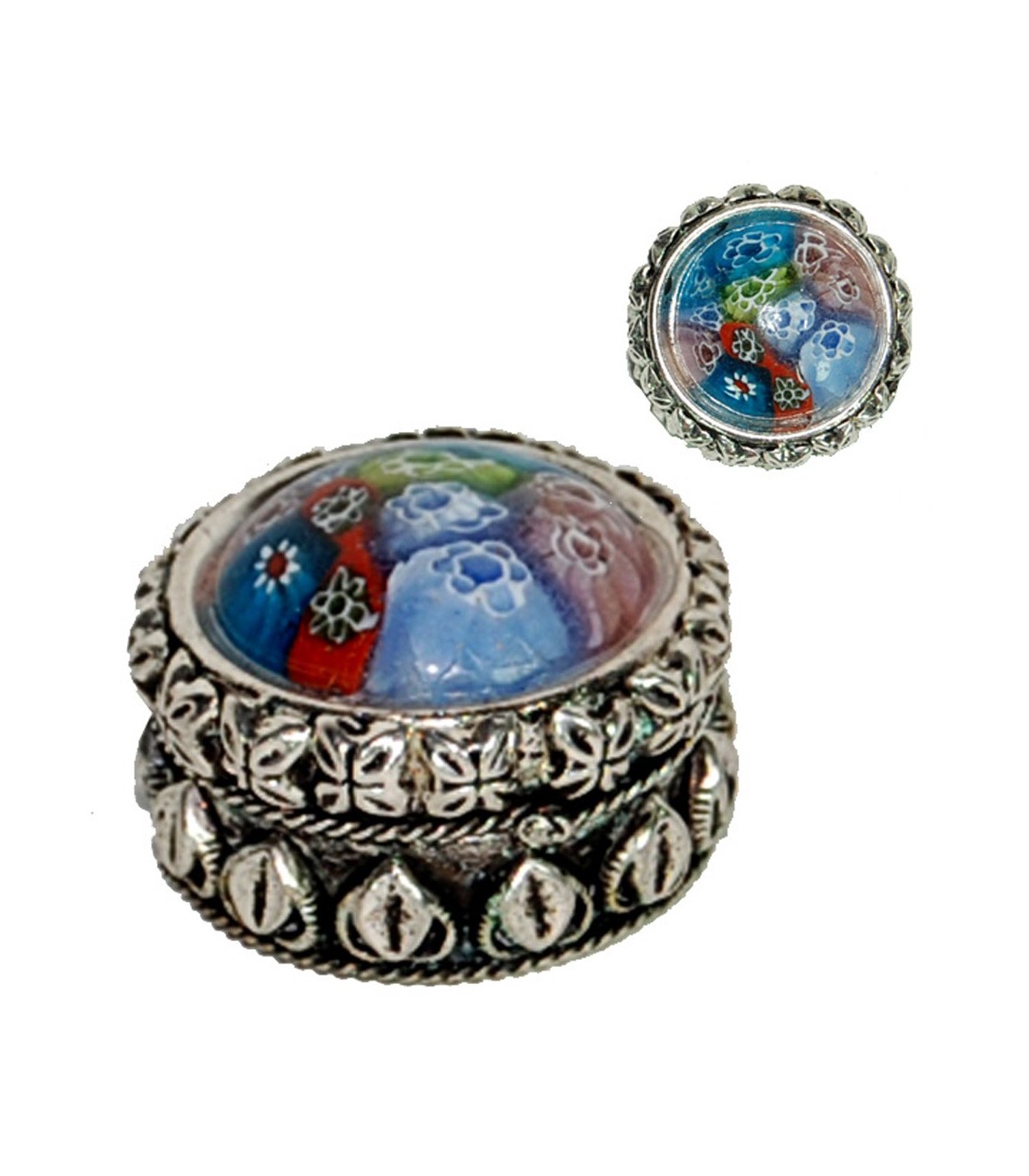 Scatola rotonda con colori vivaci intarsiati.