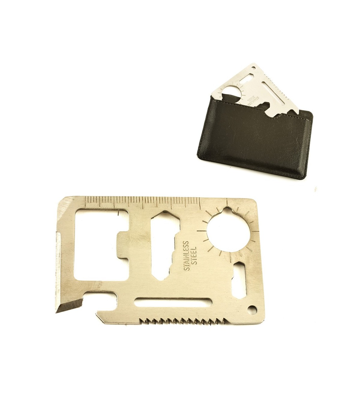 Sopravvivenza di carta in acciaio inox.Ha 11 applicazioni che potrà essere richiesto in un momento chiave della sopravvivenza.Include astuccio per il trasporto.Ideale per campeggio, campeggio, pic-nic, viaggi, ecc.Apri Models2). 2)