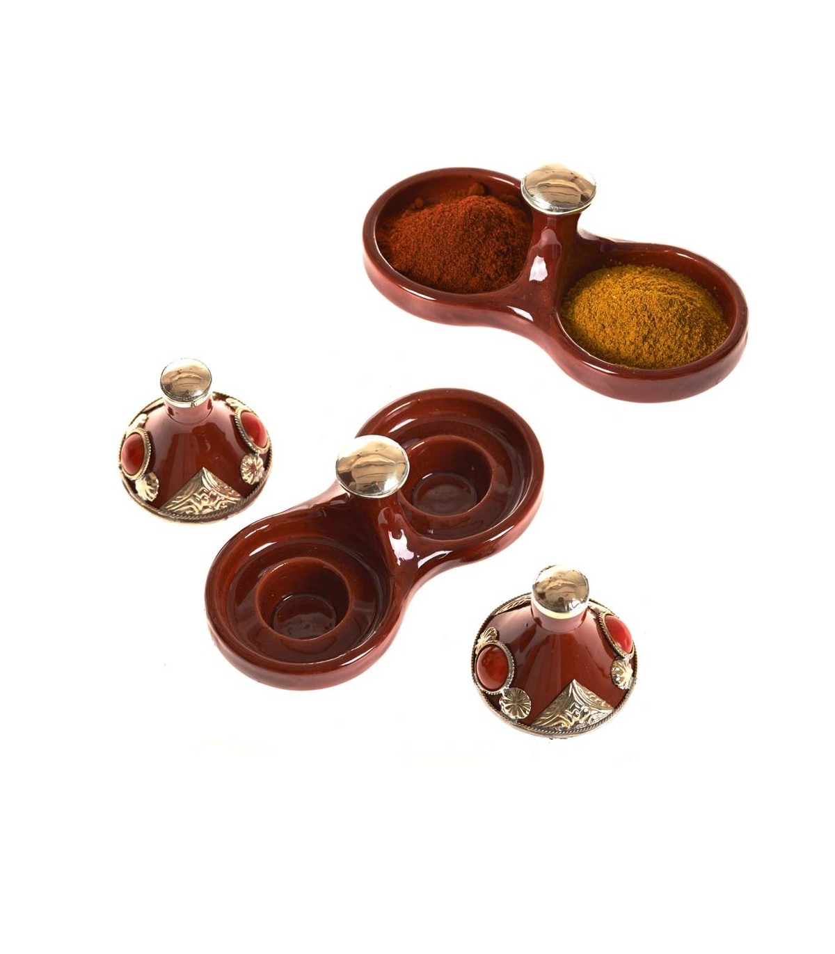 Tajin mini doppio droghiere realizzati artigianalmente in ceramica smaltata, decorata con alpaca e osso.Ideale per la presentazione di spezie come sale, pepe e cumino.Molto elegante sul tavolo, soprattutto per i piatti arabi.Disponibile in diversi