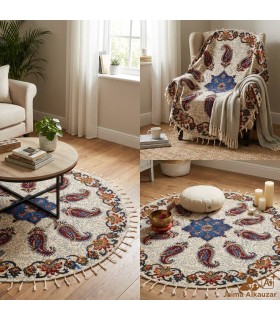 Tappeto rotondo in cotone 100% artigianale di 150 cm di diametro, prodotto in Medio Oriente con coloranti vegetali naturali. I suoi esclusivi motivi floreali possono variare, rendendo ogni pezzo un'opera unica.
