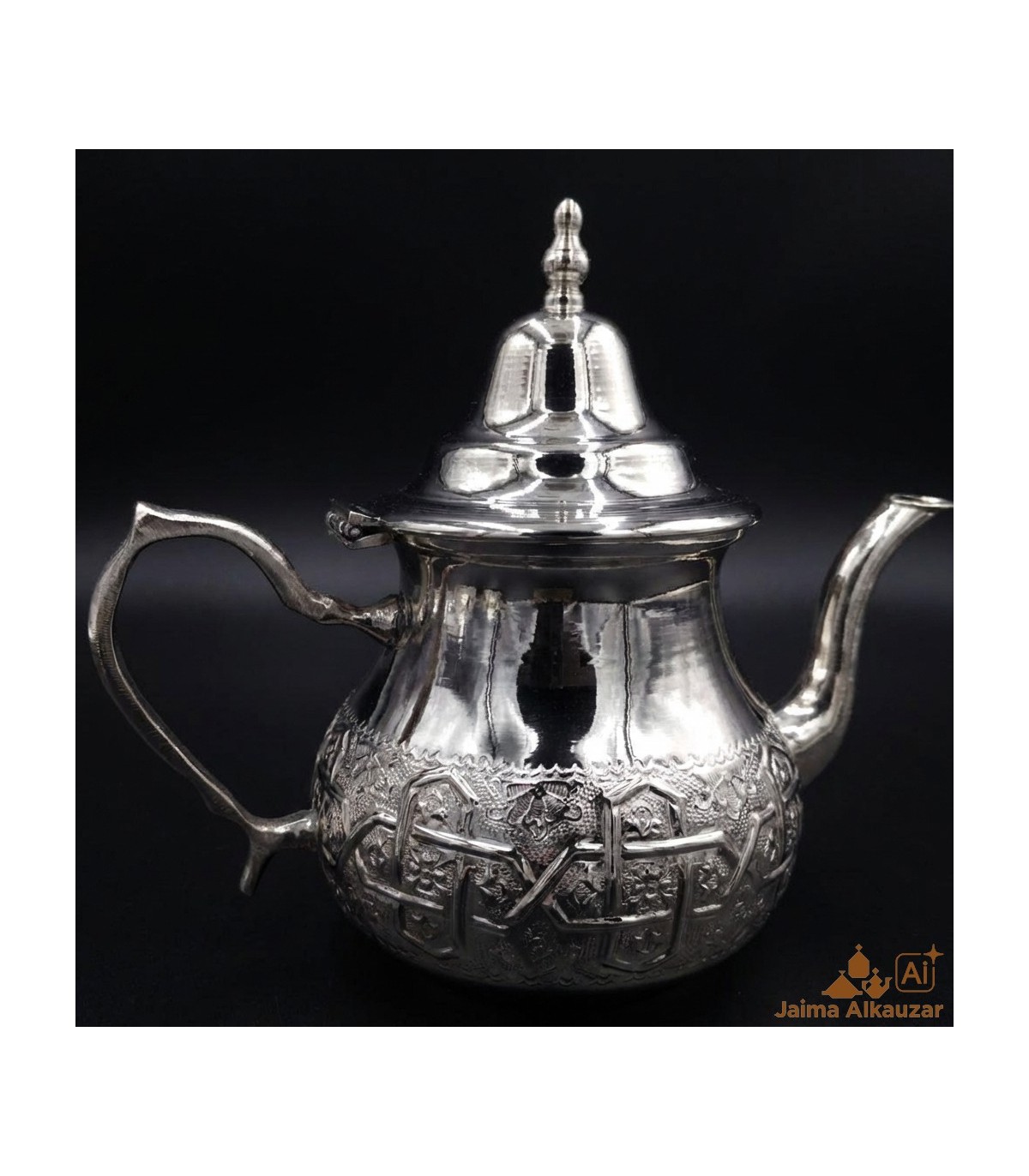 Teiera Moruna per fare il tè, in alpacca sbalzata a motivi arabi. Queste teiere marocchine sono realizzate a mano nella città di Fez.