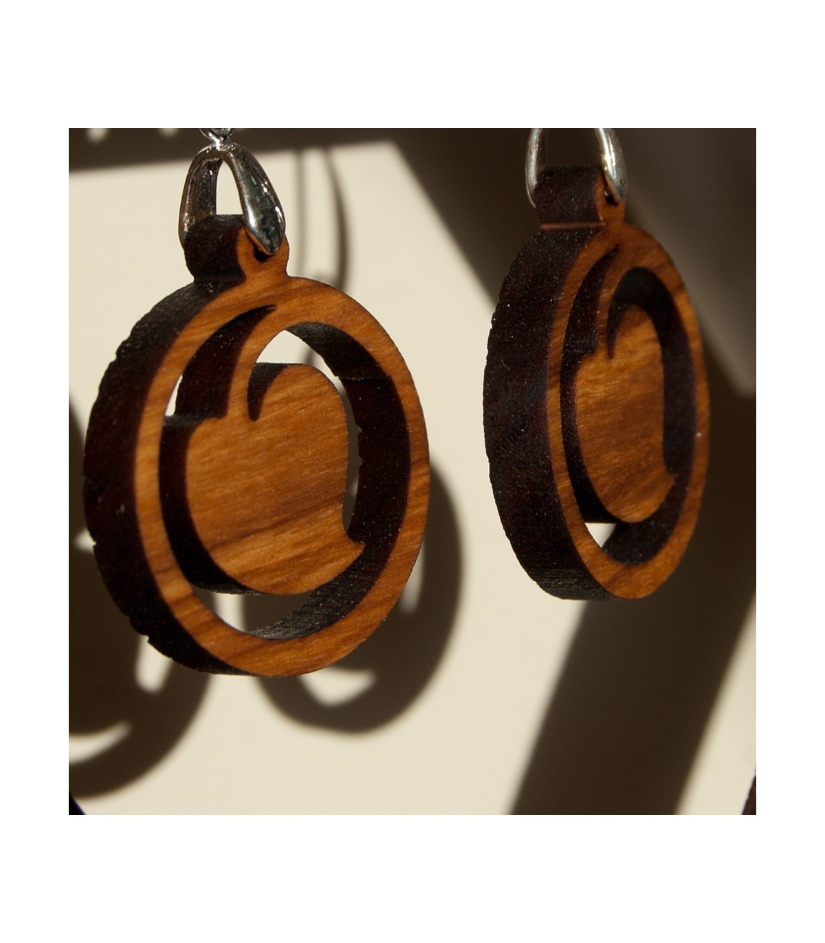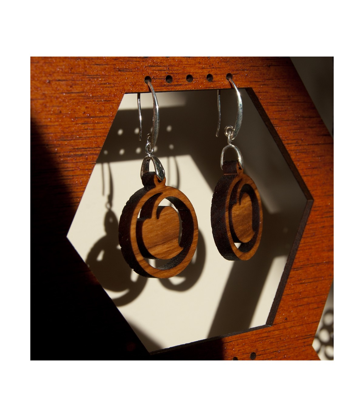 Brincos de madeira de oliveira e incrustados em prata de lei 925.