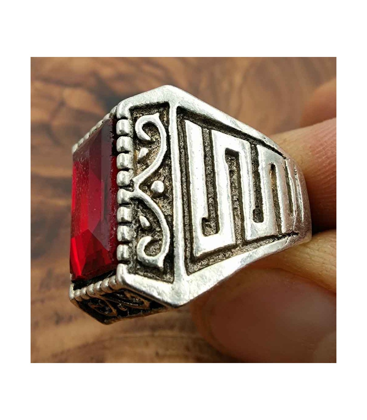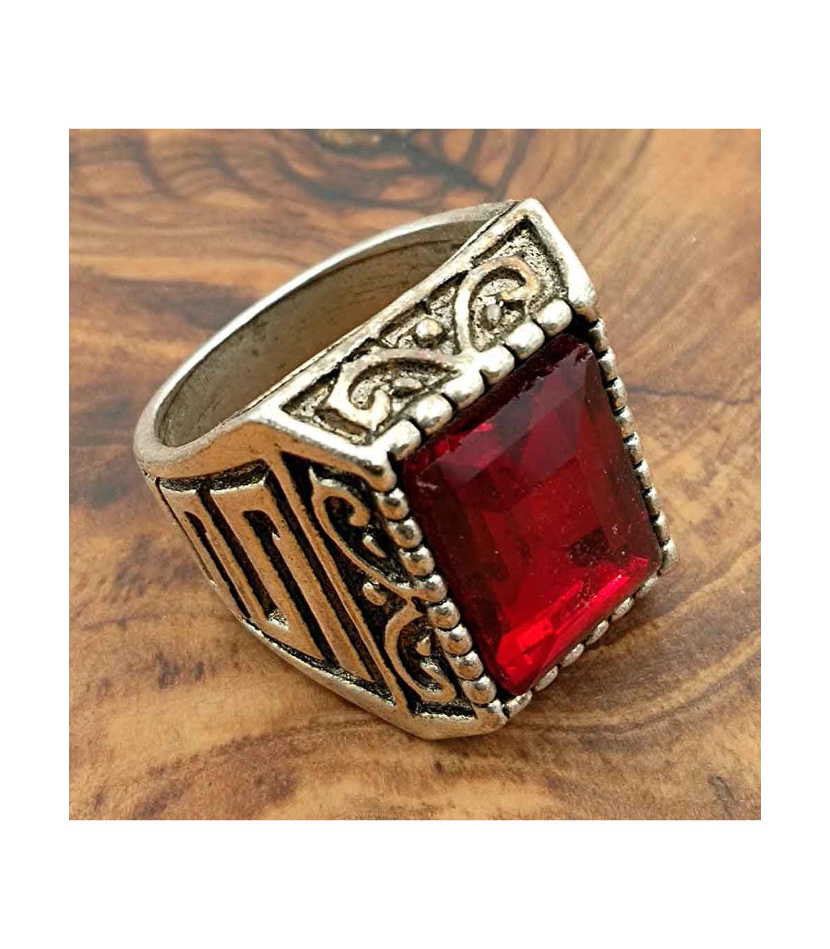 Anel de estilo gótico medieval, para cavalheiro. O metal é uma liga de Inox. A pedra é feita de resina sintética