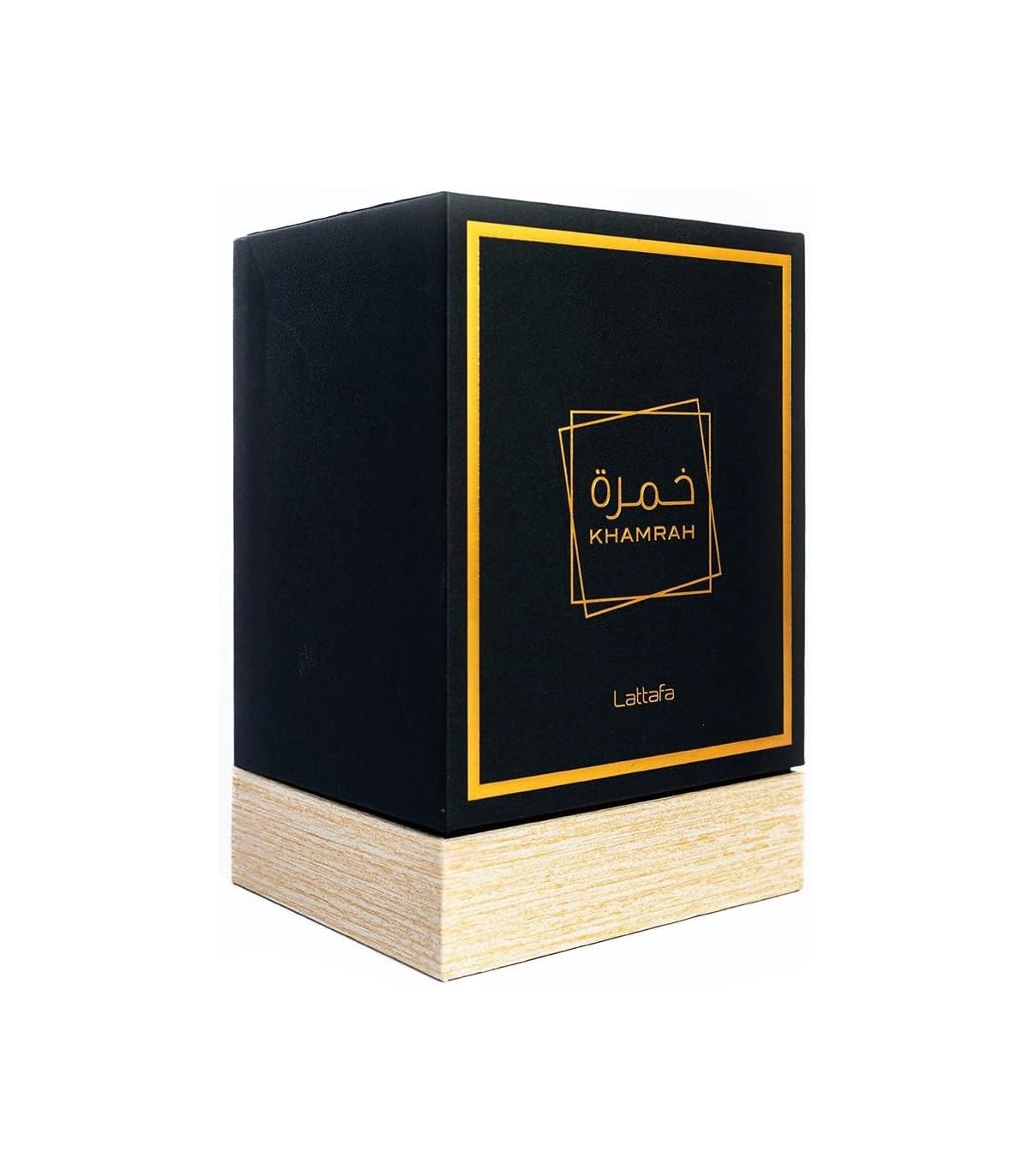 A base de Lattafa Khamrah oferece um rastro aromático opulento que mistura a doçura sensual da baunilha com madeiras preciosas picantes, oud esfumaçado e aromático, mirra aromática e benjoim resinoso. Estas notas de base brilham suavemente à luz, deixando uma impressão duradoura.