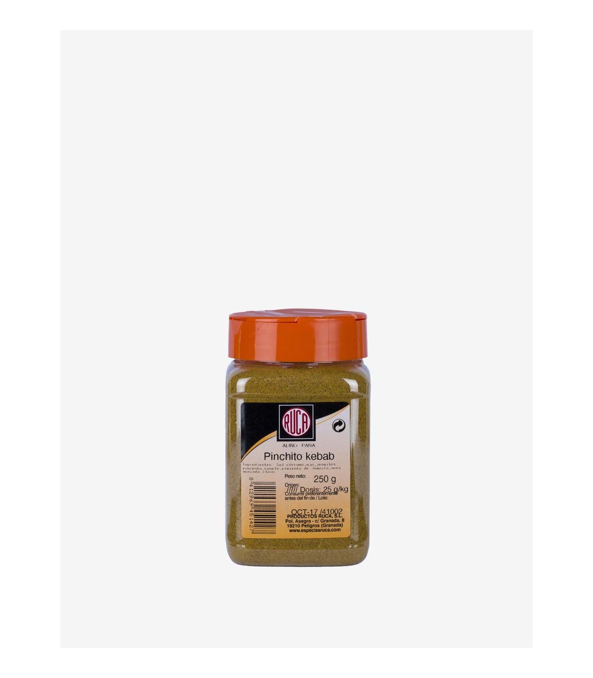 Mistura de especiarias, condimentos e aditivos, para uso culinário ou de delicatessen, para a preparação da PREPARAÇÃO DE CARNE denominada “PINCHO MORUNO” (shis kebab). Embora válida para qualquer tipo de carne, é uma receita muito adequada para cordeiro. Peso líquidoFrasco pequeno 380 ml.: 250 g. Jarra grande de 1.500 ml: 1000 g.