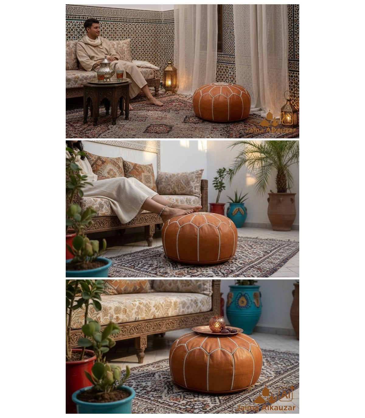 Capa para pufe marroquino com decoração árabe, confeccionada artesanalmente em couro. artigos de couro Feito em Marrocos, feito à mão, decorado com mosaico colorido e decorado com motivos dourados. Ideal para...