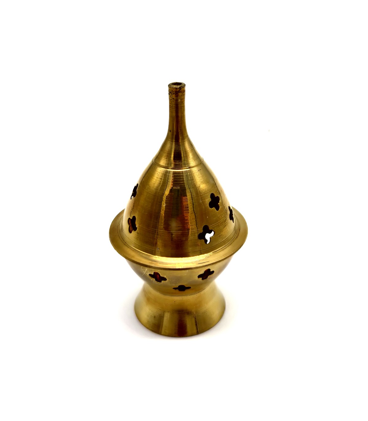 Possui base ampla e quatro pilares, com tampa perfurada com orifícios para melhor dosagem da fumaça.