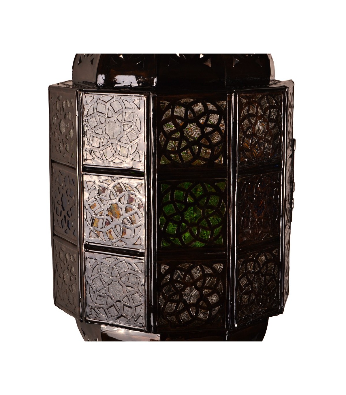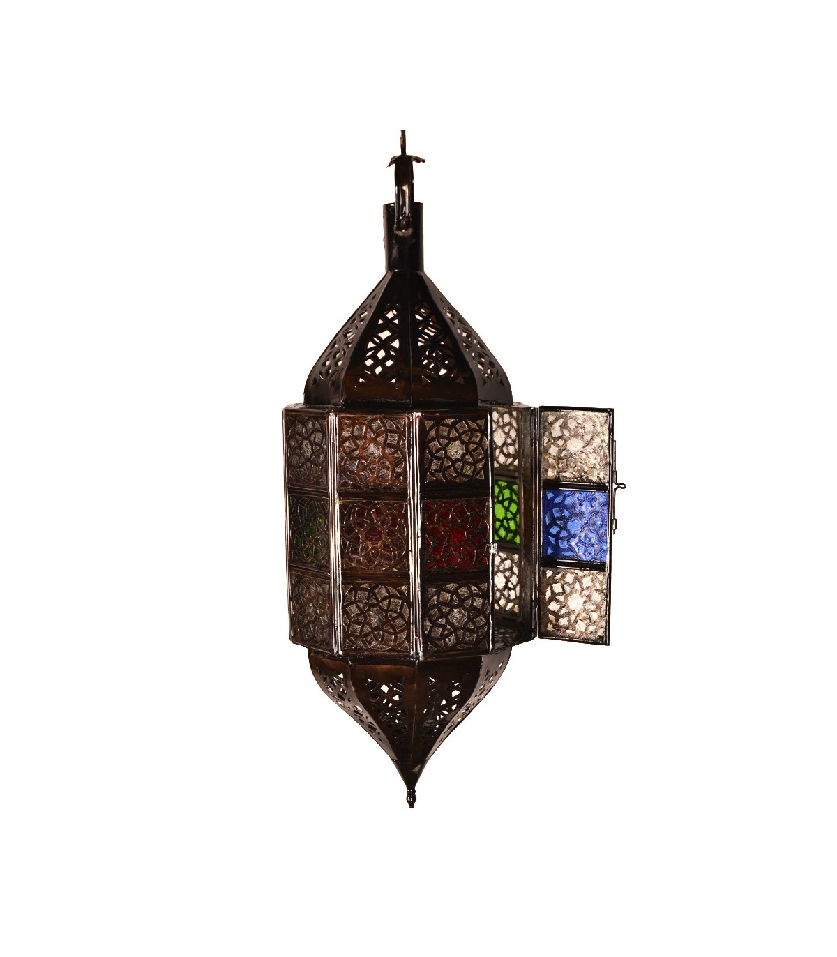 Lâmpada de estilo árabe com desenhos geométricos e cristais coloridos.