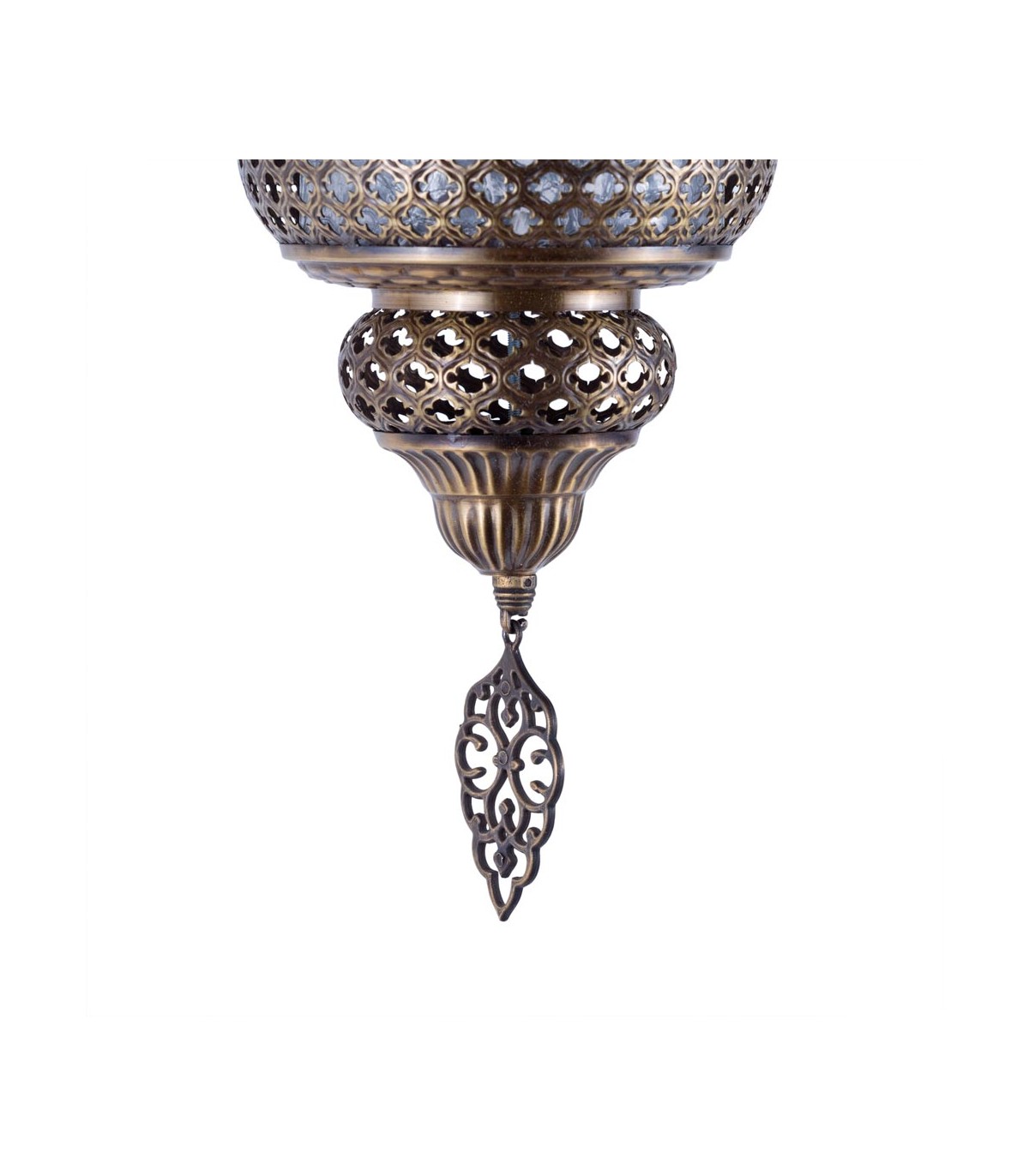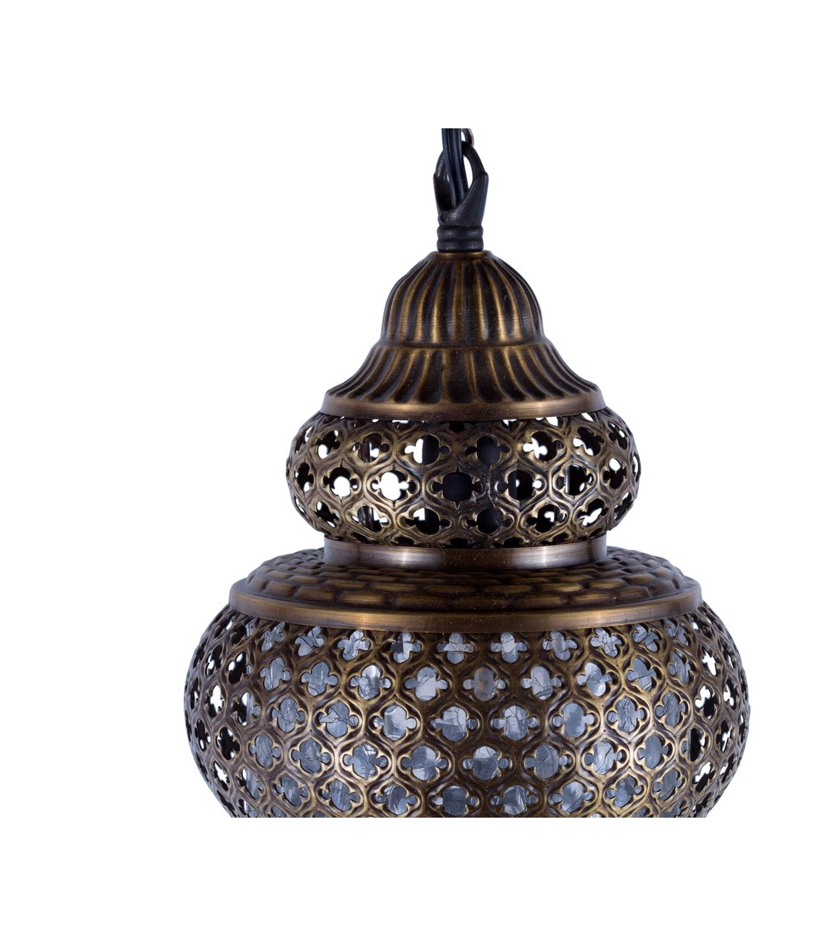 Candeeiro de tecto ou pendente turco feito em metal e vidro, na técnica de crackle metal. Pode ser pendurado no teto ou na parede com um adaptador. No jaimaAlkauzar você pode adquirir o suporteref = "https://jaimaalkauzar.es/es/arab-lamp/5720-support-o-gancho-de-pared-para-colgar-lamparas-modelo-caracol-22cm-.html">Aqui a>Graças aos mosaicos esculpidos, irá emanar uma luz única que irá criar uma atmosfera mágica e relaxante onde quer que seja colocada.