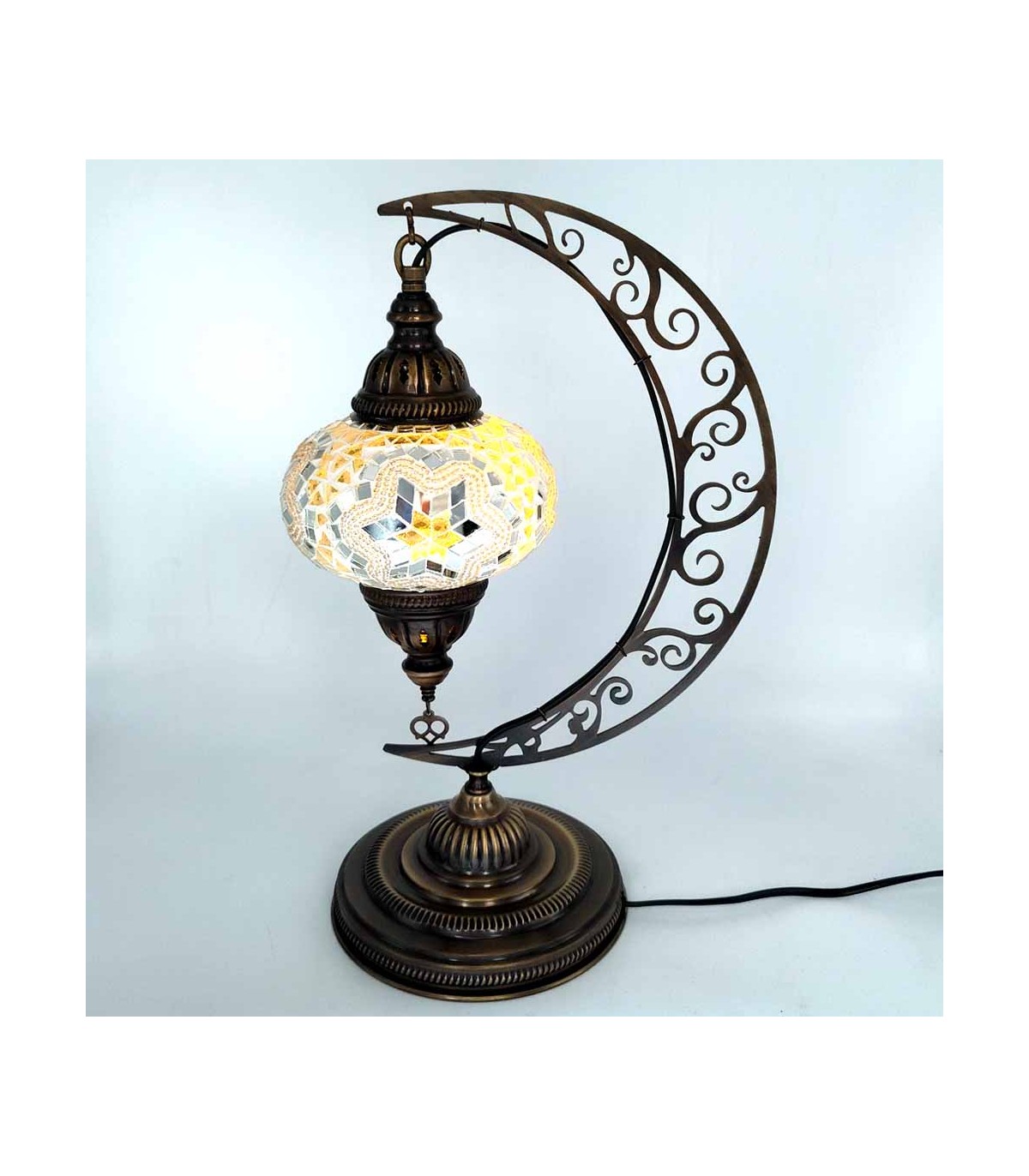 Candeeiro de mesa turco ideal para a sua mesa de cabeceira ou para o seu aparador na sala de estar. Candeeiro de vidro com mosaico decorado, candeeiro modelo Lua Nova ou Hilal em árabe. Base muito estável para um candeeiro de pé ou de mesa de alta qualidade que pode comprar online no nosso site.