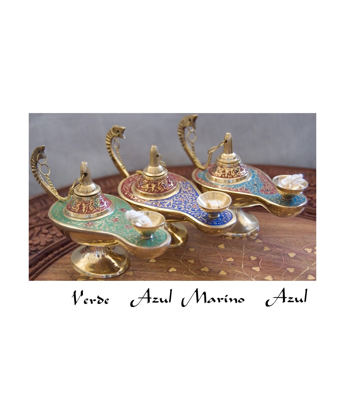 Candíl genio Aladino hecho en bronce. Incluye mecha de algodón, para utilizarlo simplemente llenar el candil con aceite (preferentemente de oliva) y esperar hasta que la mecha se impregne. Disponible en tres tamaños y tres colores. Se puede comprar el juego completo de los tres tamaños en un mismo color. Si desa los tres tamaños en colores varios (un color cada tamaño), indíquelo en la casilla "Comentarios sobre su Pedido" mientras esté realizando su pedido.