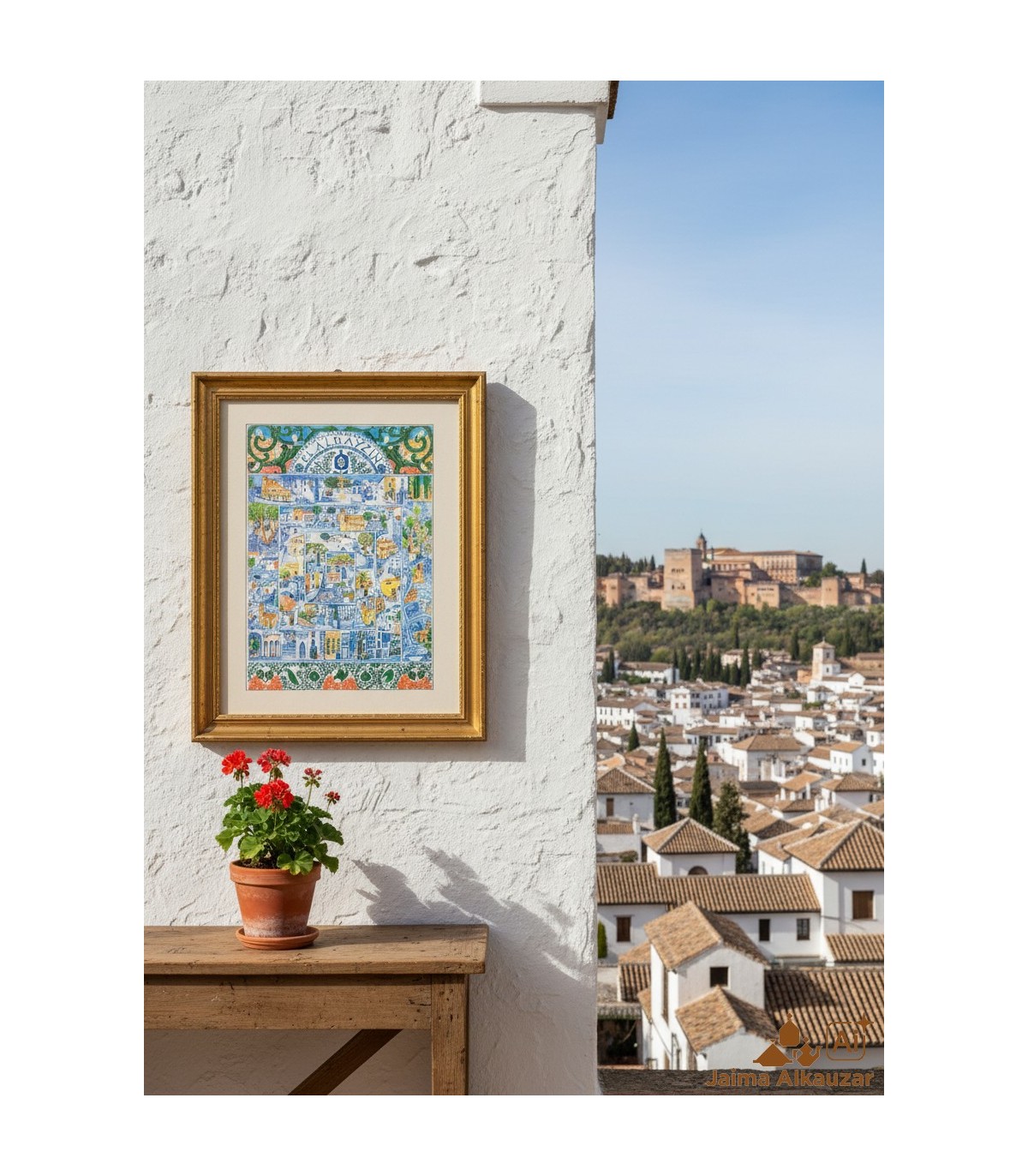 Pôster artístico do Albaicín de Granada, pintado à mão livre em aquarela. Reflete as ruas brancas, cármenes e vistas para a Alhambra.