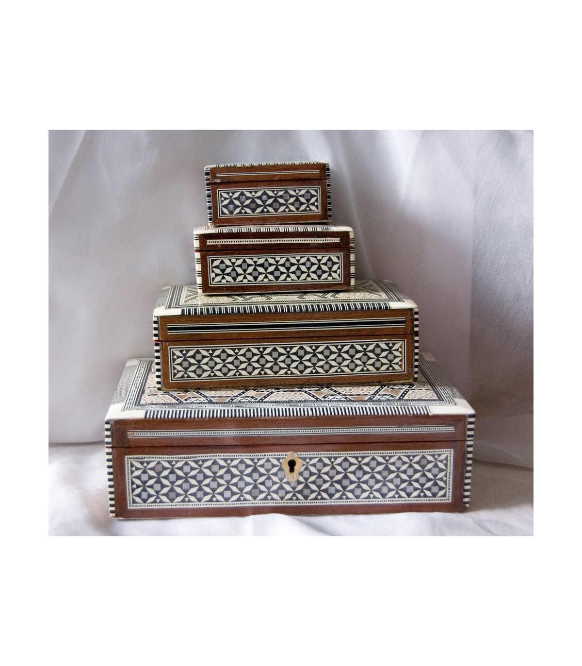 Joyero rectángular de taracea blanca. Incrustaciones de madera y nacar. Forrado interiormente en terciopelo rojo.