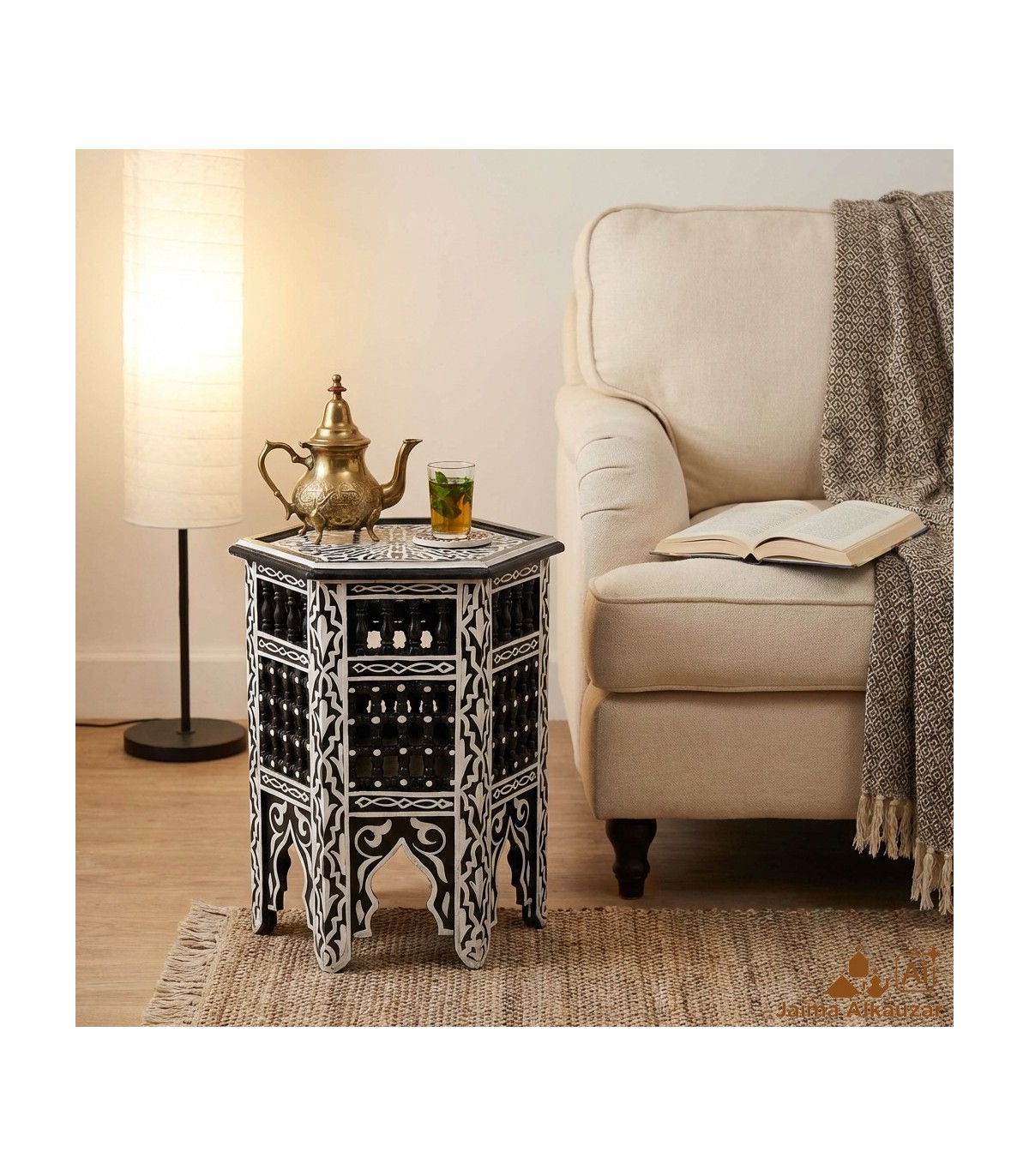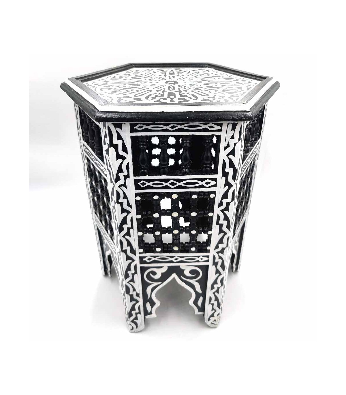 Mesa de apoio para a sua casa, feita à mão em Marrocos, ideal para decorar a sua casa ao estilo andaluz, feita em madeira e decorada com treliças e pintada à mão.