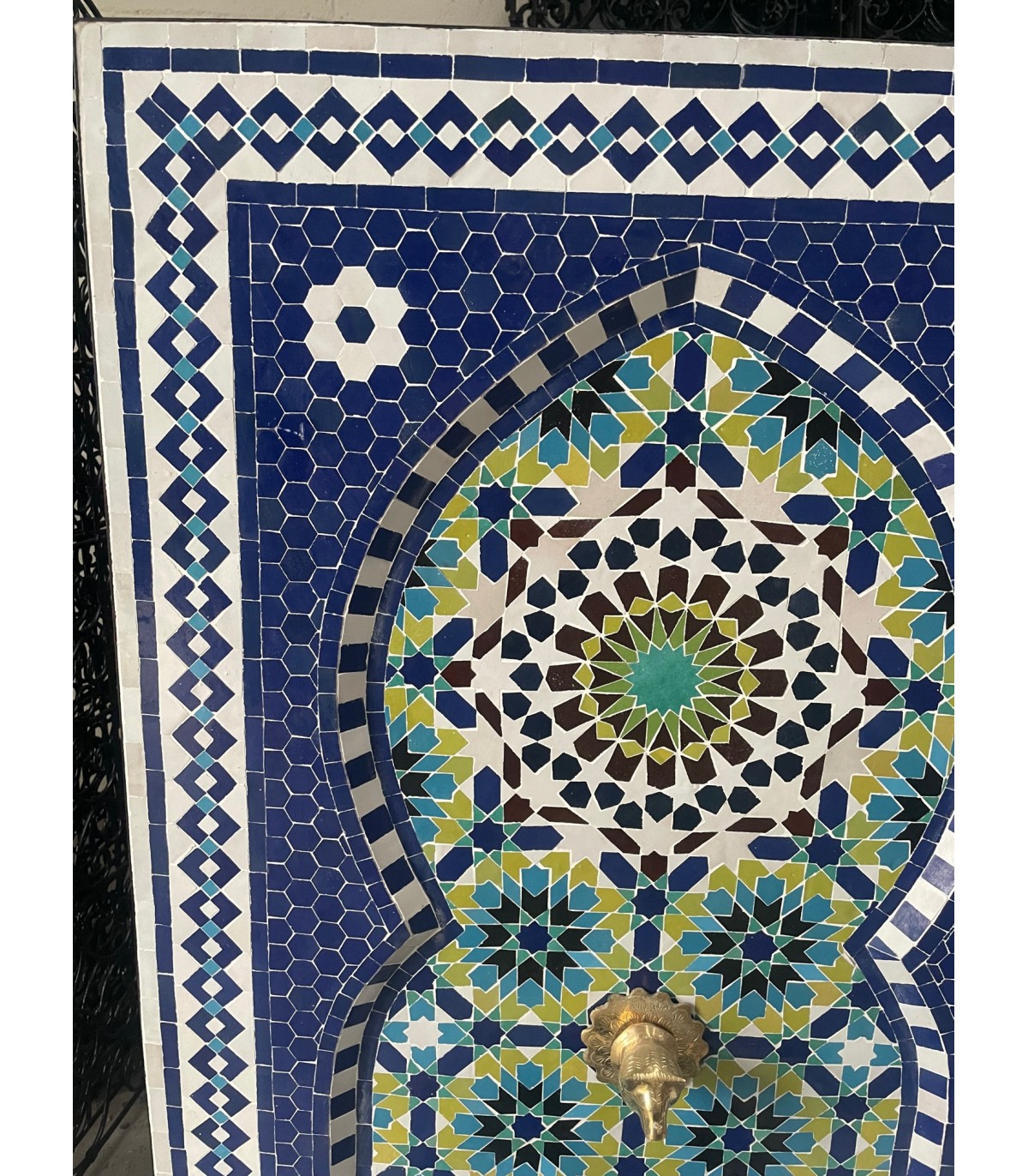 Fonte de mosaico artesanal forte>Andaluz elaborado, desenhado e montado em Marrocospor mestres artesãos da famosa cidade de FEZ usando a técnica ancestral da telha zelige, ensinada pelas mestras artesãs da antiga Al-Andalus e mantida até agora de pai para filho.