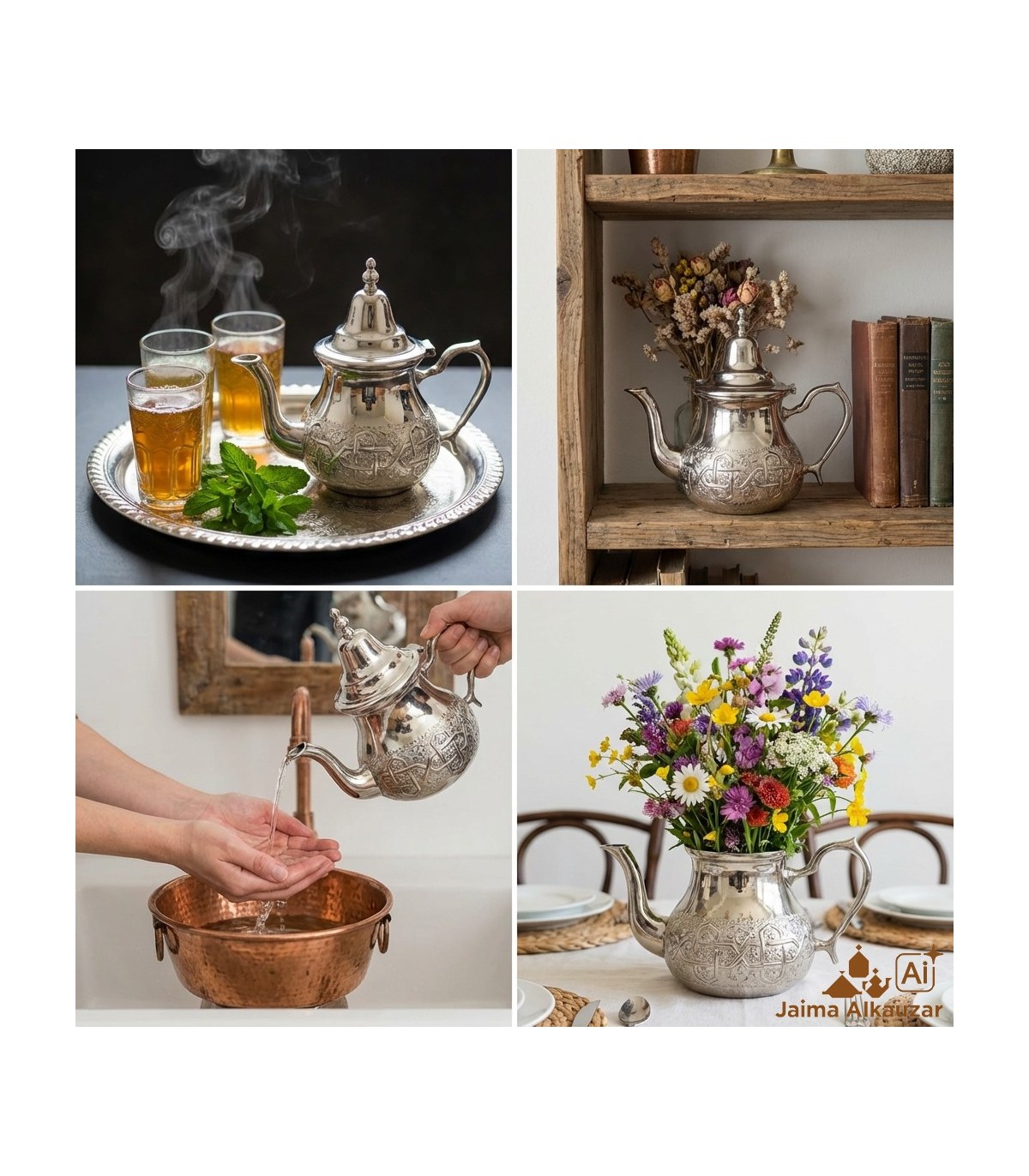 Bule Moruna para fazer chá, prata níquel com motivos árabes em relevo. Estes bules marroquinos são feitos à mão na cidade de Fez.
