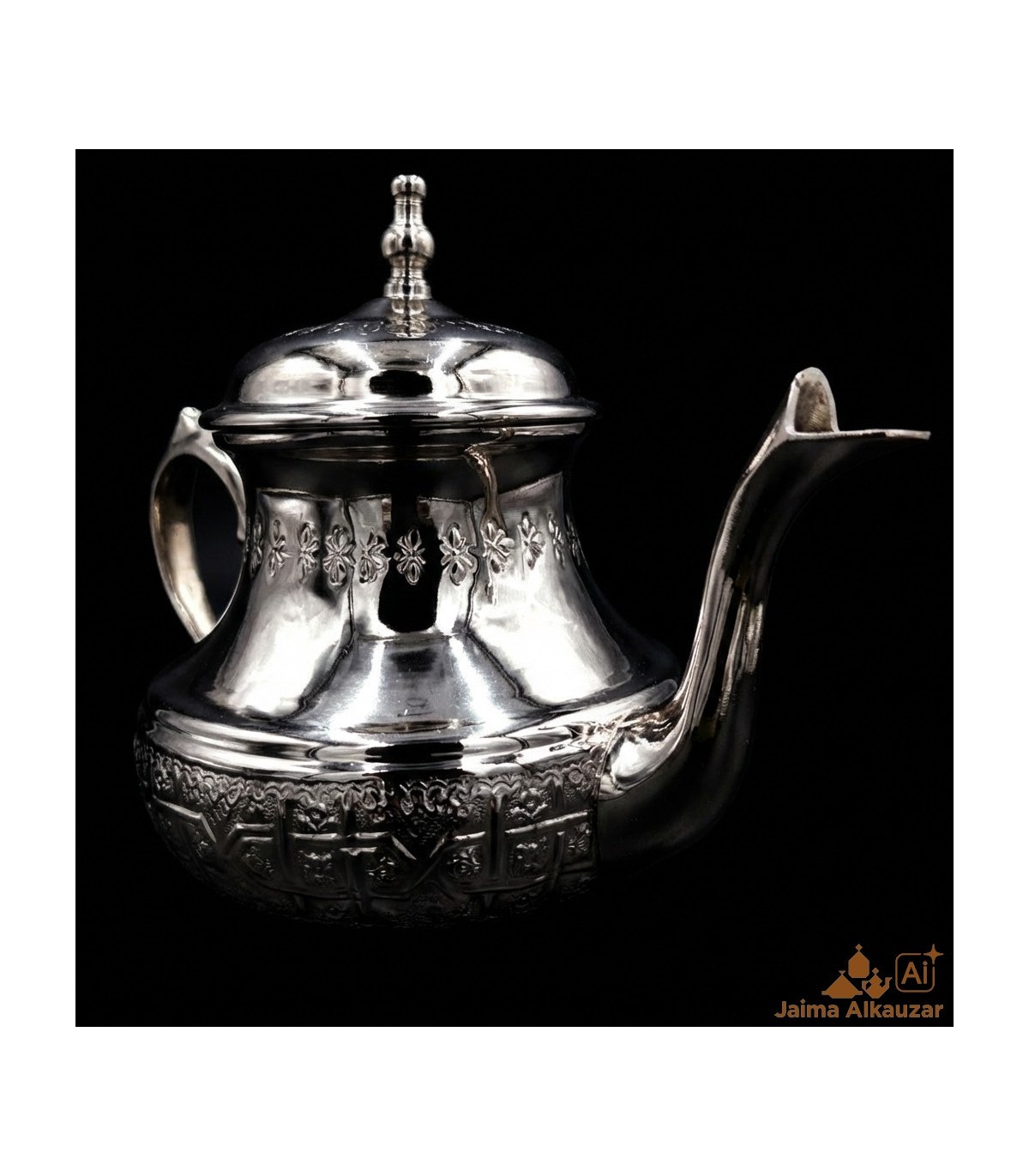Bule Moruna para fazer chá, prata níquel com motivos árabes em relevo. Estes bules marroquinos são feitos à mão na cidade de Fez.